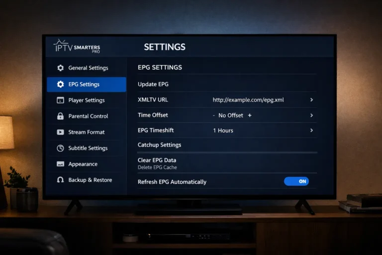Electronic Program Guide helpt je te zien wat er op elk kanaal wordt uitgezonden. Vraag je IPTV-provider om de EPG-URL en voeg deze toe onder Settings > EPG. Update de EPG dagelijks voor actuele programma-informatie.